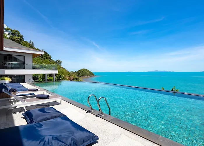 Die 6-Zimmer- Villa Agara-5 Bedroom Cliffside Ocean Front Villa Ko Samui liegt in 9 Gehminuten Entfernung vom Strand Laem Yai und bietet allen Gästen einen Swimmingpool und eine Terrasse. Die Villa bietet den Jacuzzi und liegt 3 km weit weg vom Bang Por.